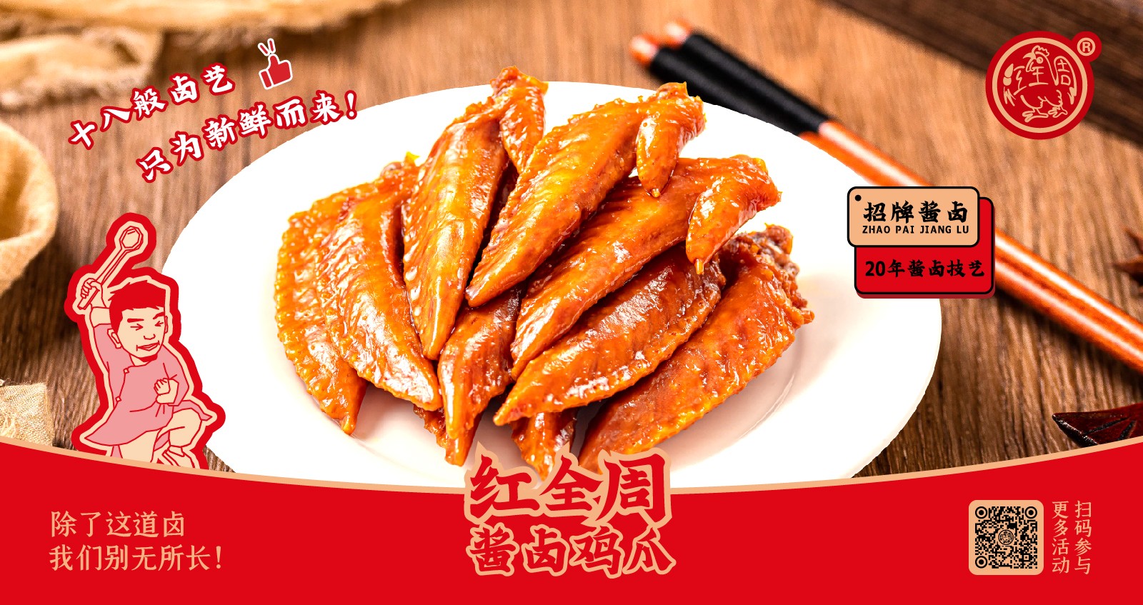 紅全周品牌創立于2012年,其生產總部坐落在以“紅全周雞爪”聞名的福建泉州市南安洪瀨鎮,經張福來師傅多年研制而成的獨家秘方,獨特的鹵制工藝,以“鮮、香、韌、辣”的特點,贏得廣大食客的交口稱贊。紅全周繼承中華美食傳統,堅持以“細微處見風范,毫厘間定乾坤”的服務準則,遵循現代健康飲食理念,精選上等食材,致力為消費者提供安全、健康的美食新體驗。